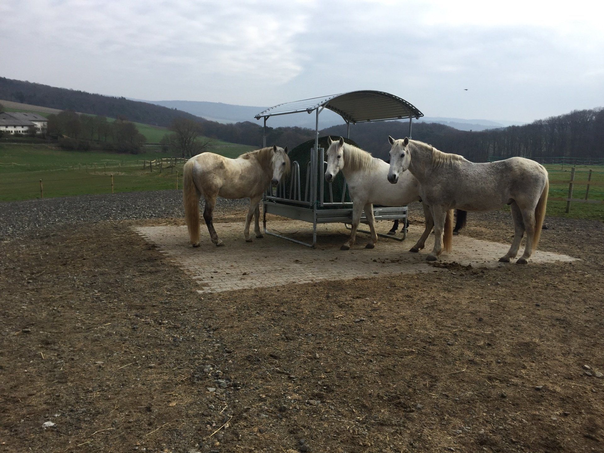 Es gibt mehrere Überdachte Heuraufen, Wälz- und Spielbereiche.